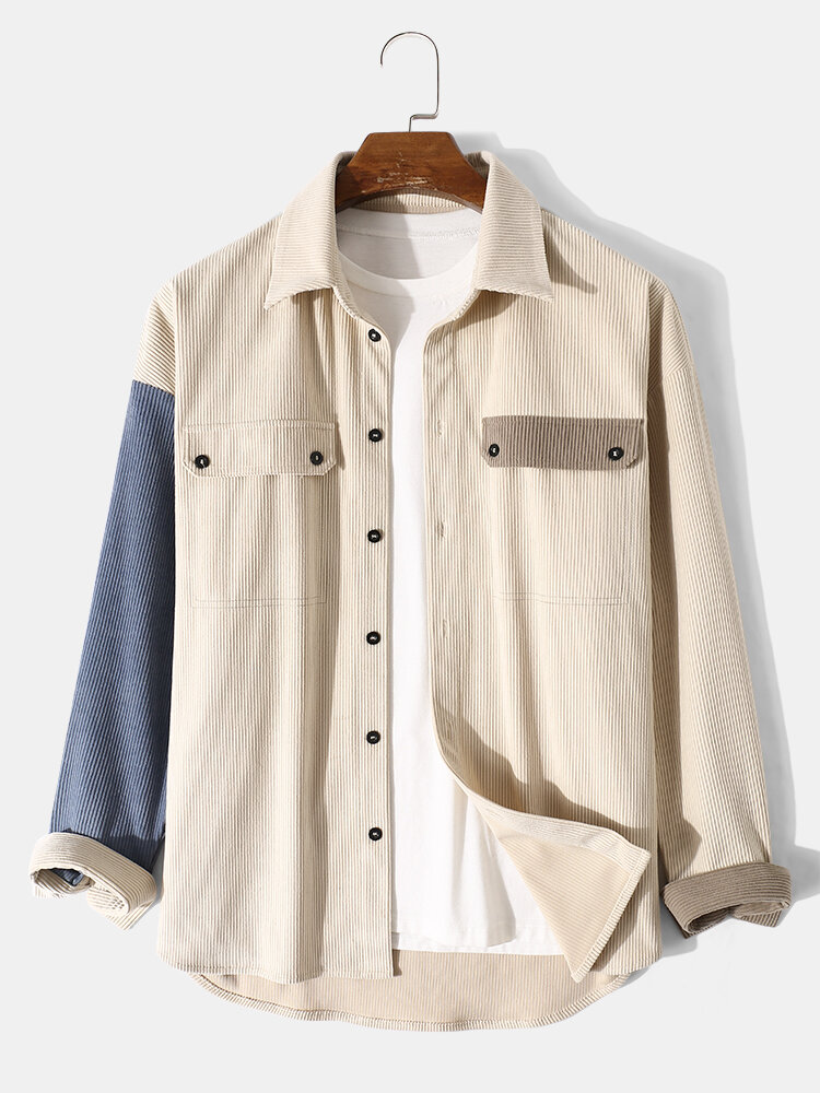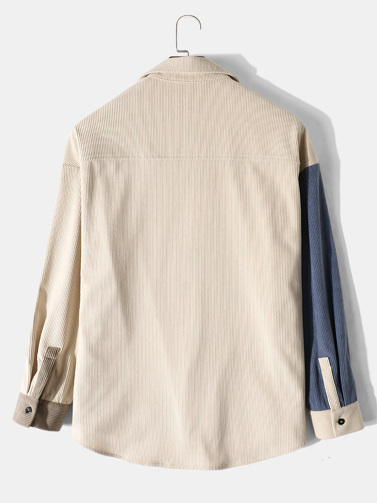 Men Corduroy Flap Pocket Contrast Stitching Button Casual Shirts – Apricot S