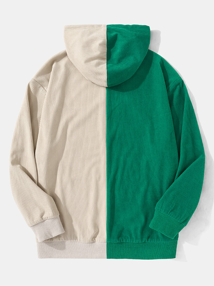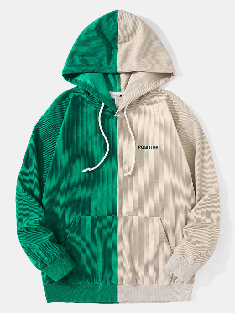 Men Corduroy Green Patchwork Letter Casual Hooded Sweatshirt – Green S