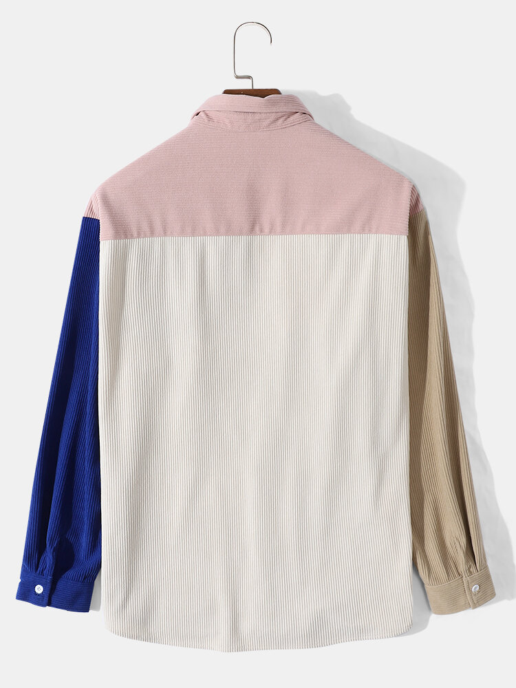 Men Corduroy Klein Blue Patchwork Chest Pocket Button Up Casual Shirts – Apricot S