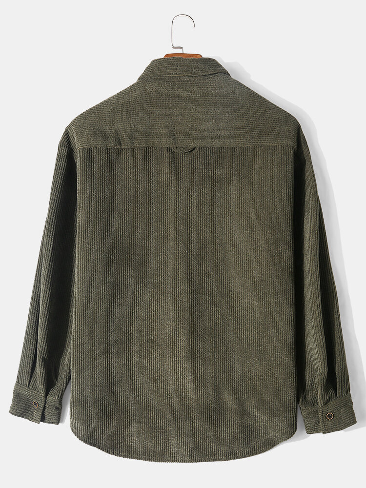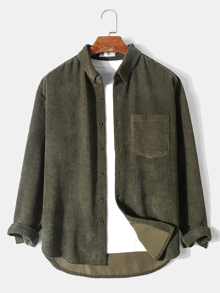 Men Corduroy Sheer Chest Pocket Curved Hem Long Sleeve Casual Shirts – Green S