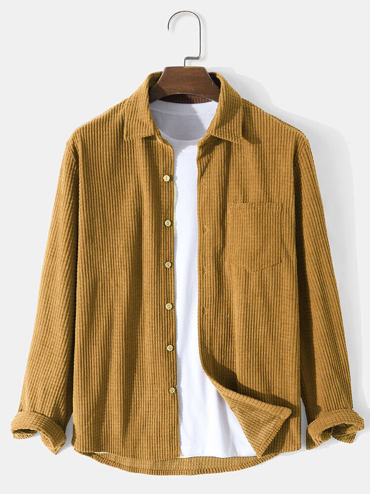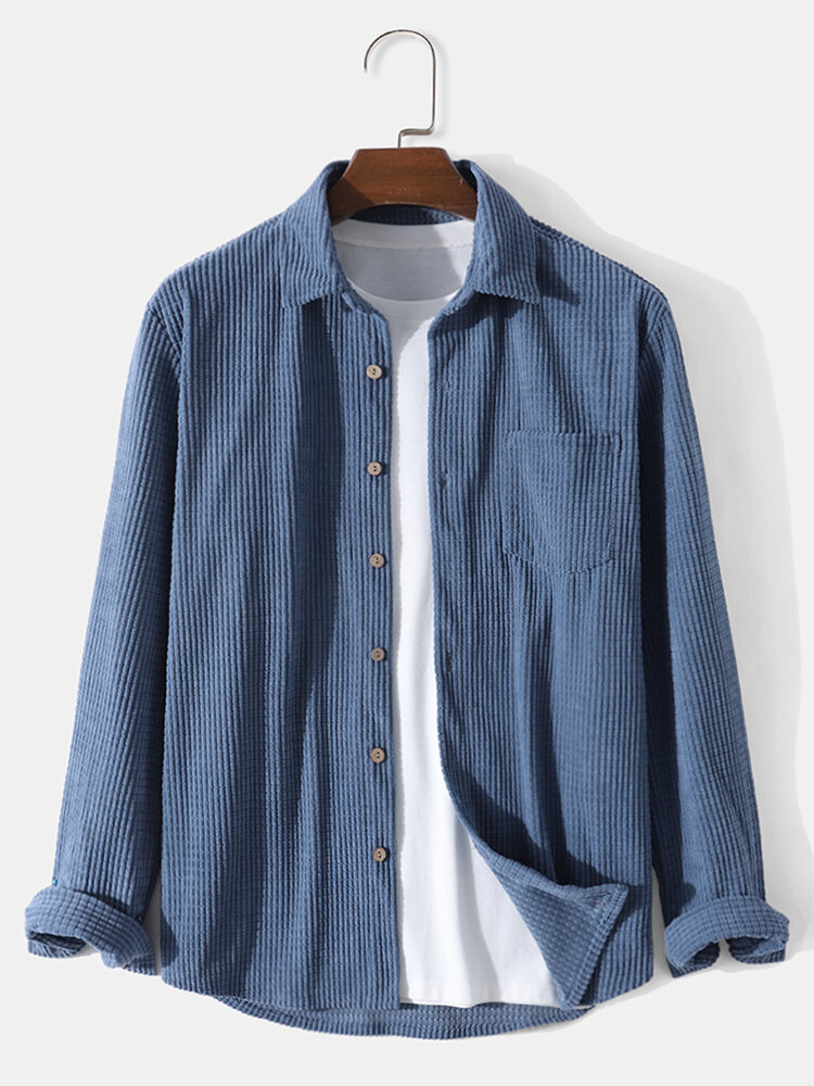 Men Corduroy Solid Lapel Collar Button Long Sleeve Shirt – Blue 2XL