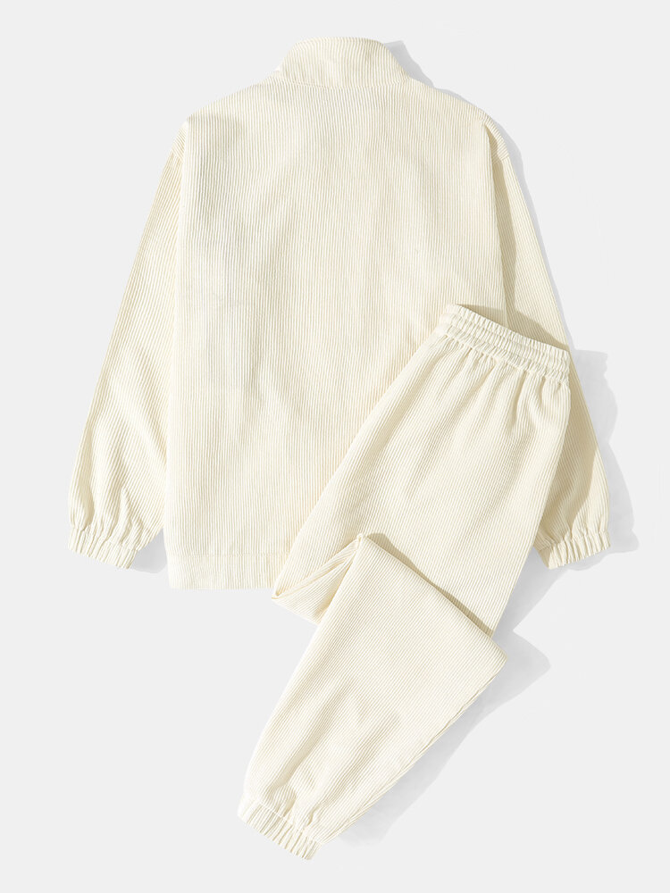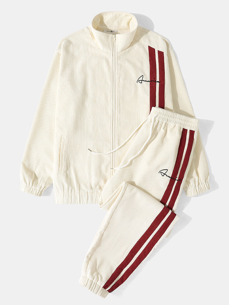 Men Corduroy Striped Contrast Color Block Zipper Casual Two Piece Suits – Apricot S