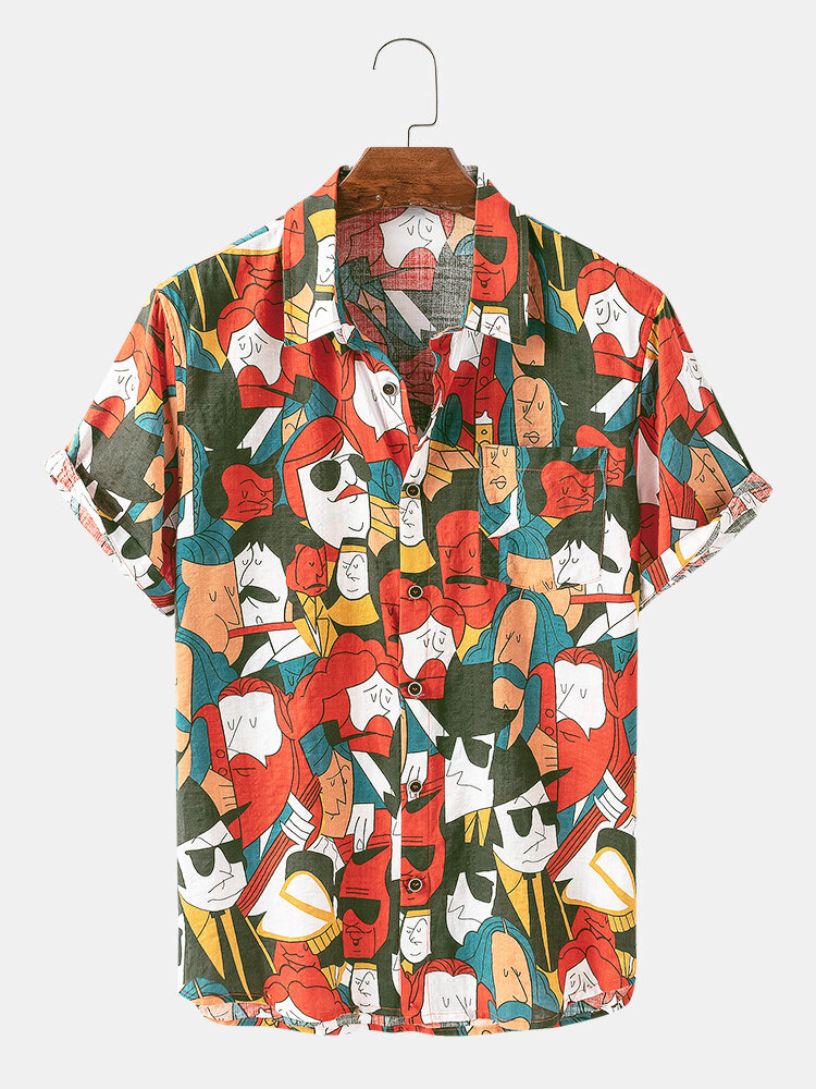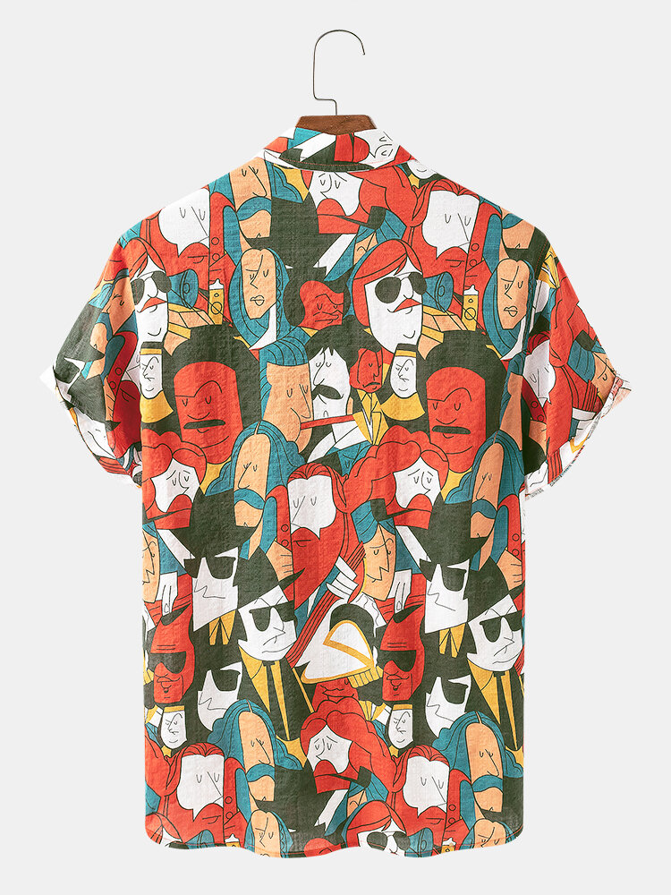 Men Cotton Funny Cartoon Figure Print Patch Pocket Breathable Short Sleeve Lapel Collar Shirts – Green XL