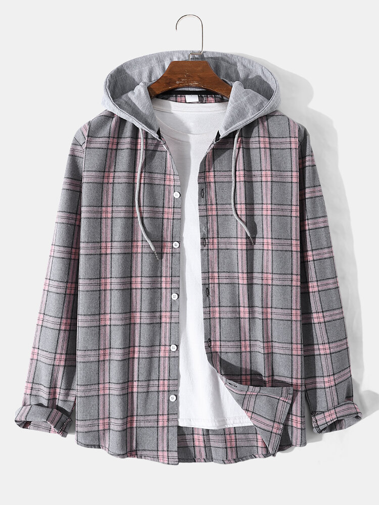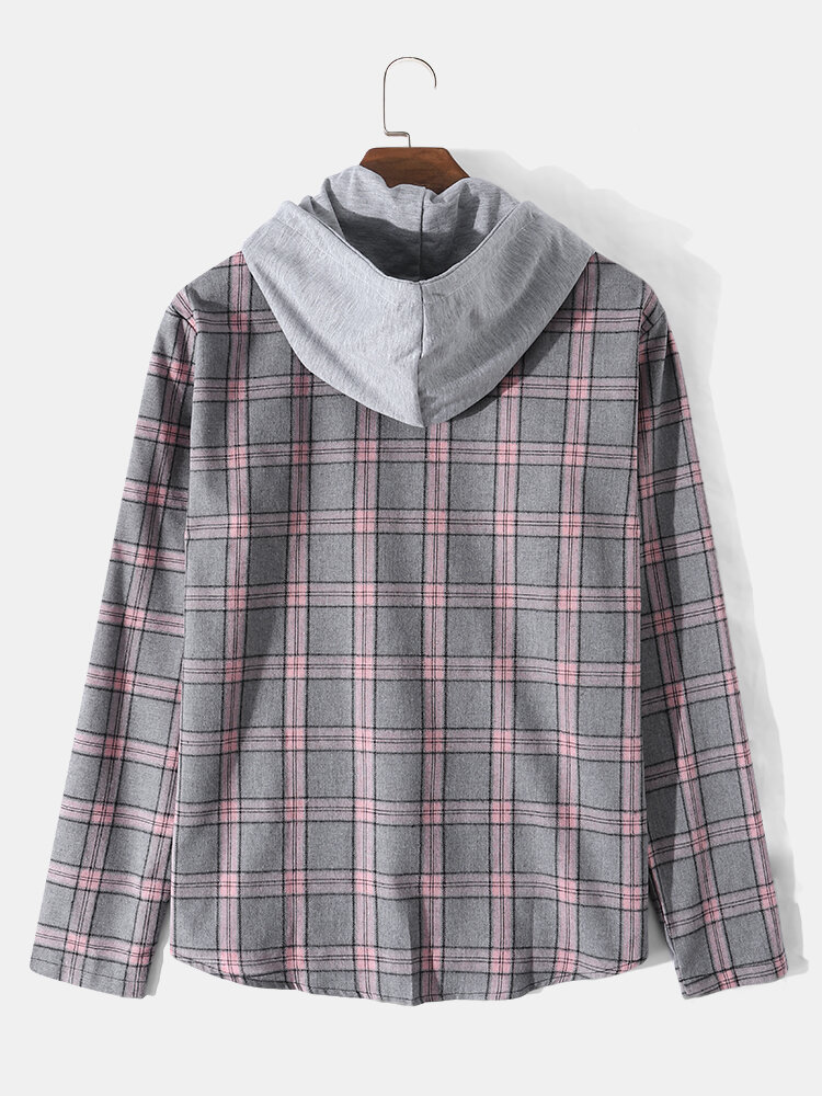 Men Cotton Plaid Hooded Collar Buttons Long Sleeve Casual Shirts – Pink L
