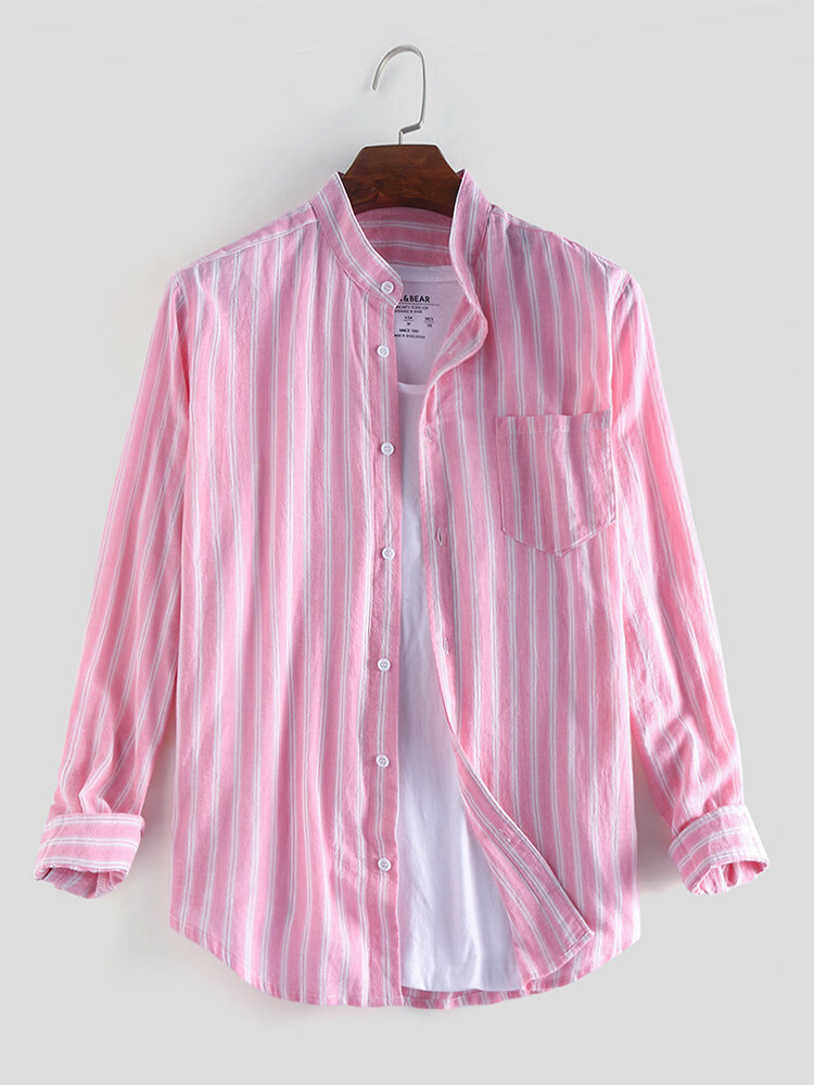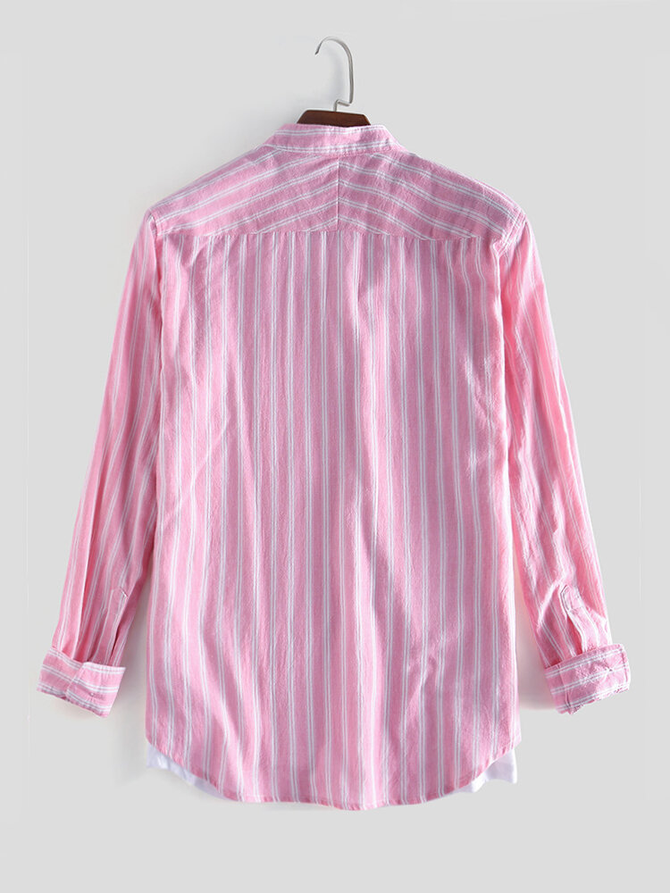 Men Cotton Stripe Plain Color Stand Collar Long Sleeve Shirts – 2XL Blue