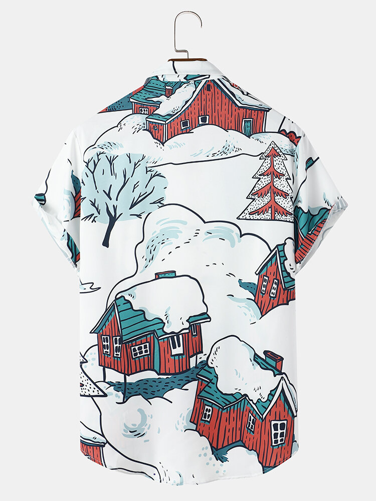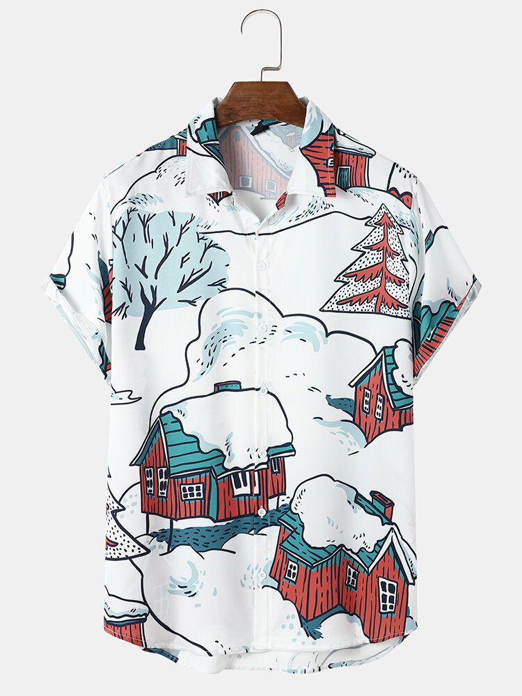 Men Cute Pattern Snow Button Short Sleeve Casual Shirts – White M