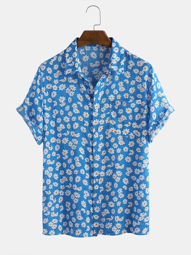 Men Daisy Spray Floral Printed Cotton Holiday Casual Short Sleeve Shirts – Blue XL