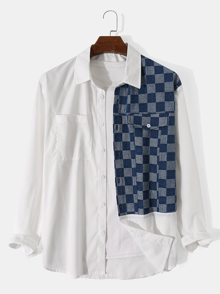Men Denim Patchwork Button up Chest Pocket Casual Shirts – Beige S