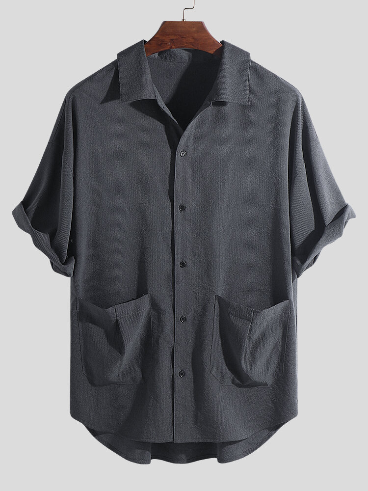 Men Dual Pockets Turn Down Collar Half Sleeve Shirts – XL Brown