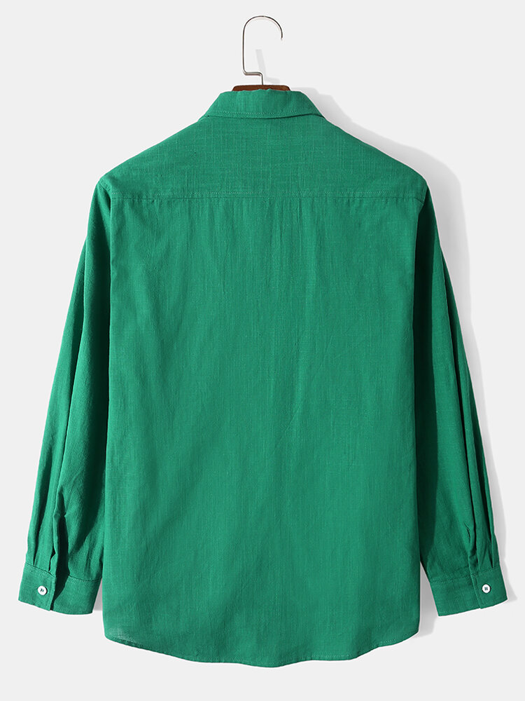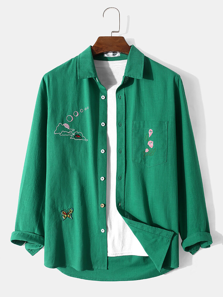 Men Embroidered 100% Cotton Long Sleeve Lapel Collar Curved Hem Casual Shirts – Green S