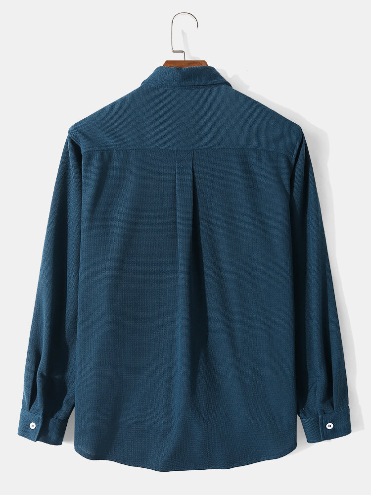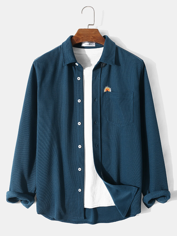 Men Embroidered Chest Pocket Long Sleeve Lapel Collar Casual Shirts – Blue S