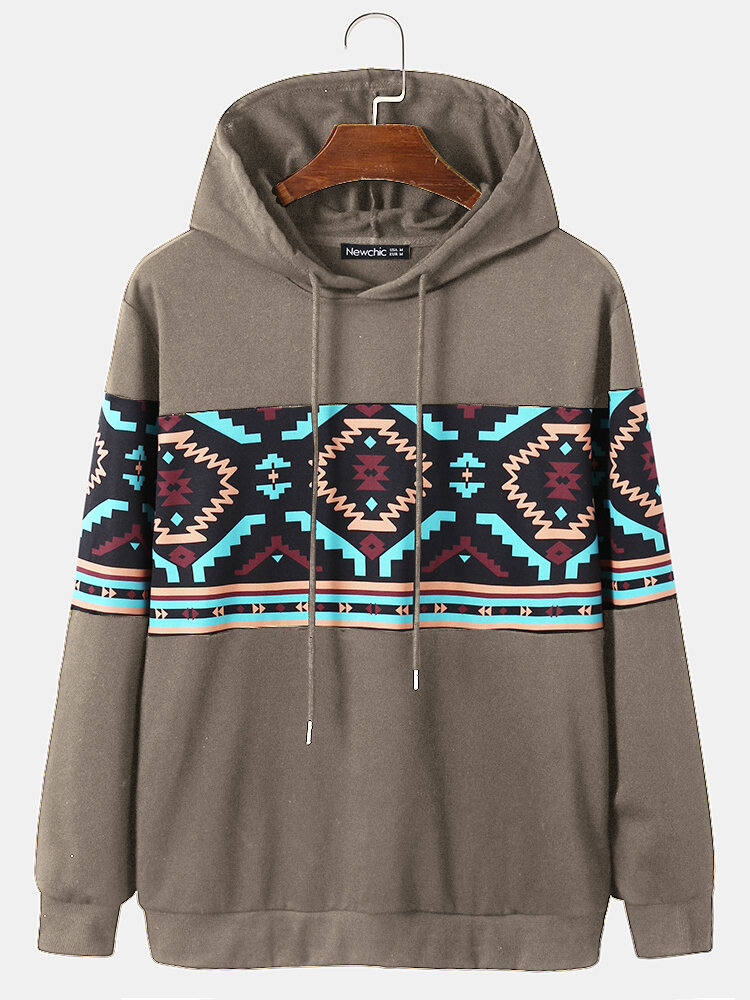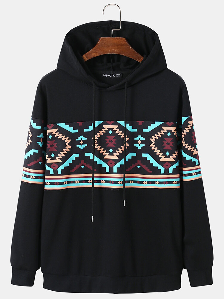 Men Ethnic Lattice Drawstring Long Sleeve Casual Hooded Sweatshirt – Black S