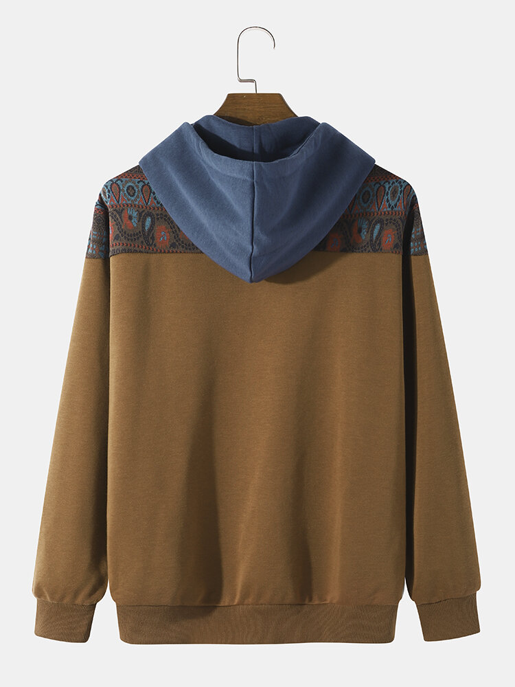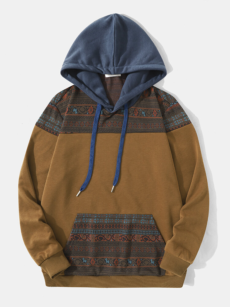 Men Ethnic Patchwork Pattern Contrast Kangaroo Pocket Hooded Sweatshirt – Coffee S