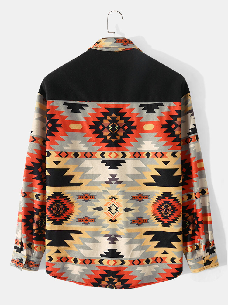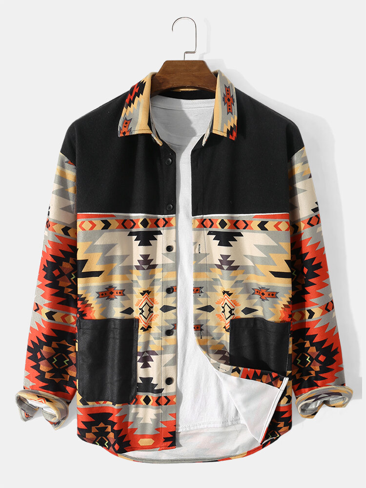 Men Ethnic Pattern Patchwork Color Block Lapel Casual Shirts – Black S