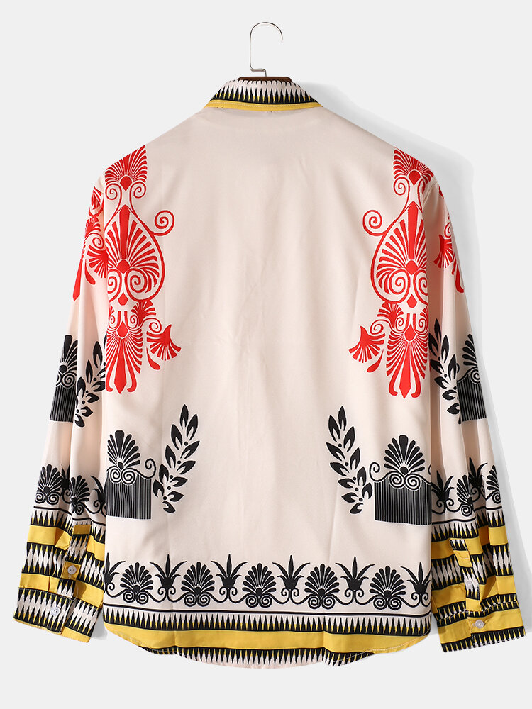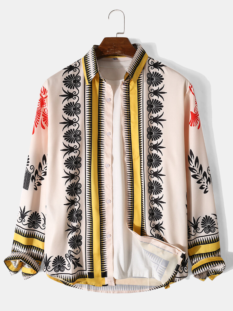 Men Ethnic Printed Curved Hem Flower Long Sleeve Casual Shirts – Apricot M