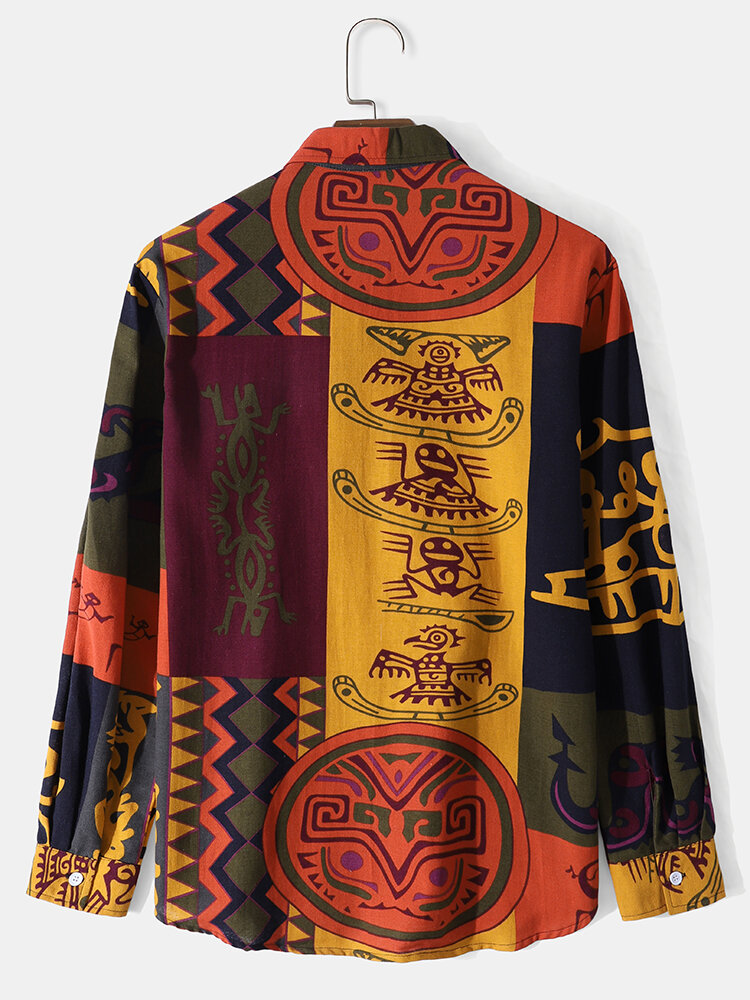 Men Ethnic Tribal Pattern Colorblock Casual Cotton Long Sleeve Shirts – Green 2XL