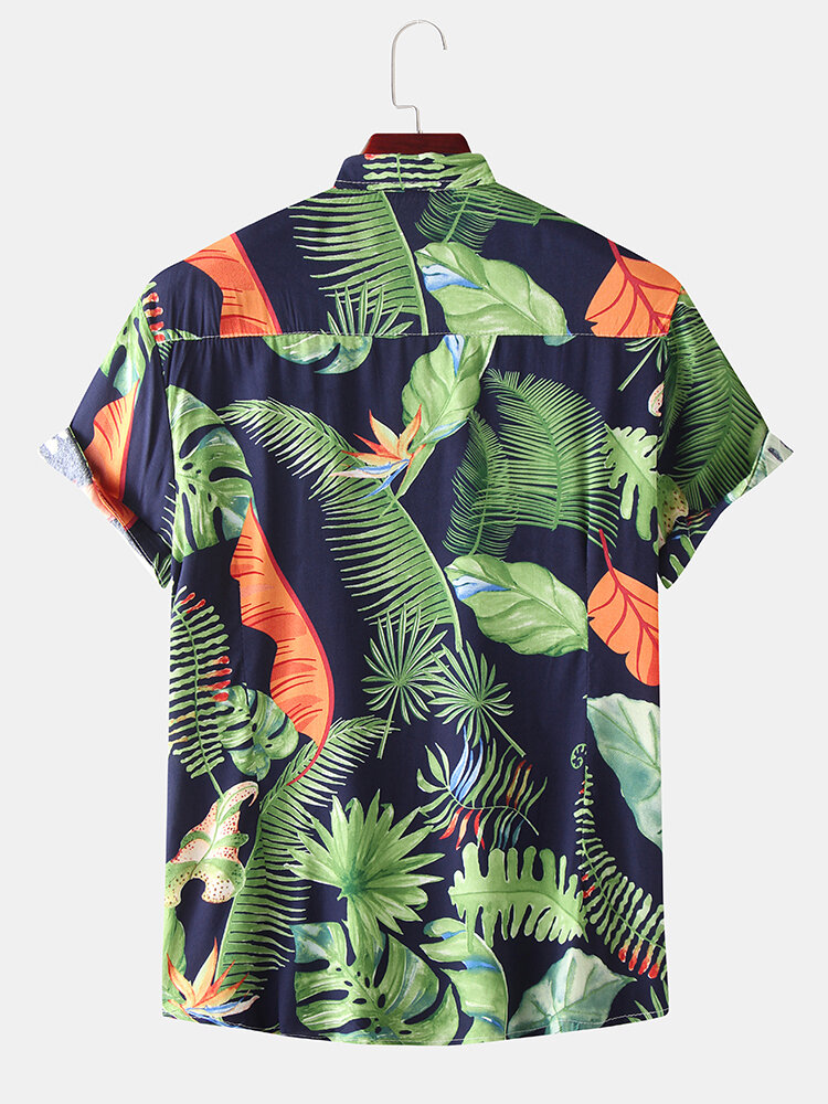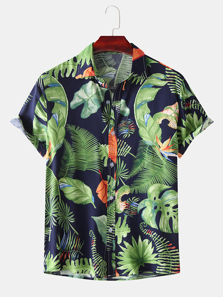 Men Fashion Plant Leaves Print Turn Down Collar Hawaii Beach Short Sleeve Shirts – Navy L