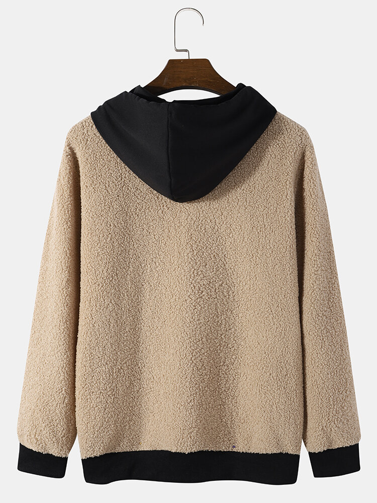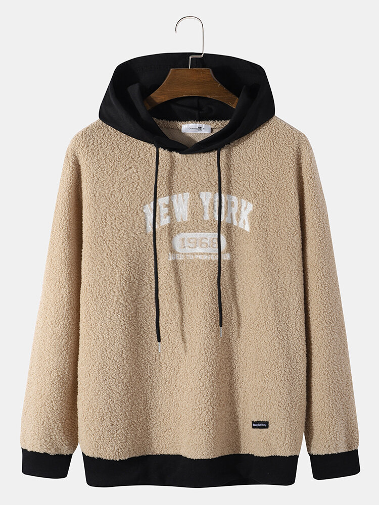Men Fleece Patchwork Contrast Letter Patch Hem Drawstring Hooded Sweatshirt – Khaki S
