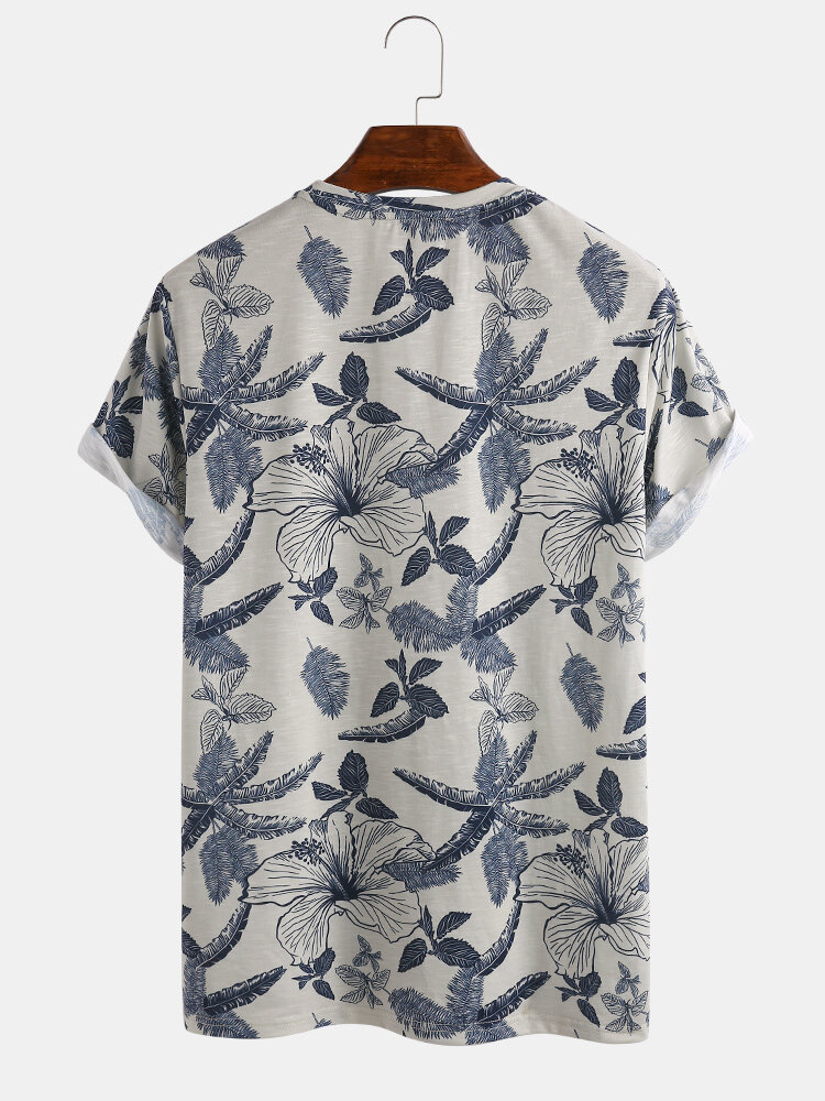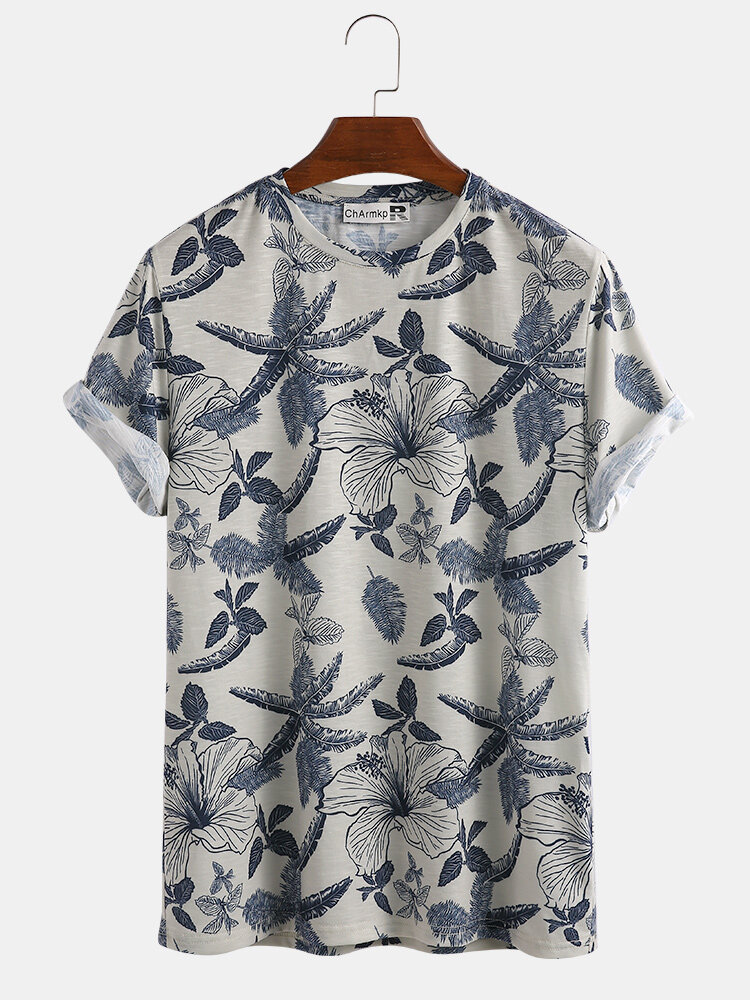 Men Floral Print Crew Neck Short Sleeve Casual T-Shirts – Khaki 2XL