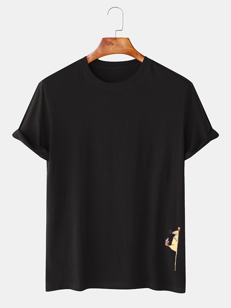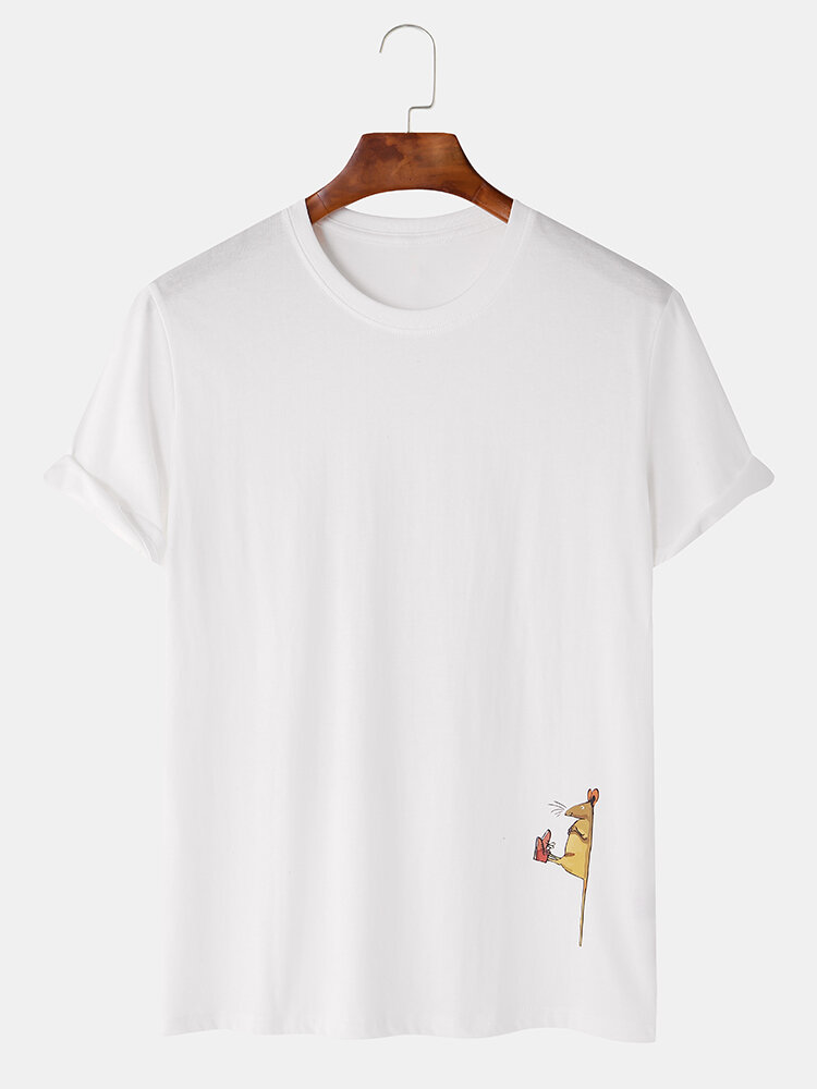 Men Funny Cartoon Cat & Mouse Print Crew Neck Short Sleeve T-Shirts – White S