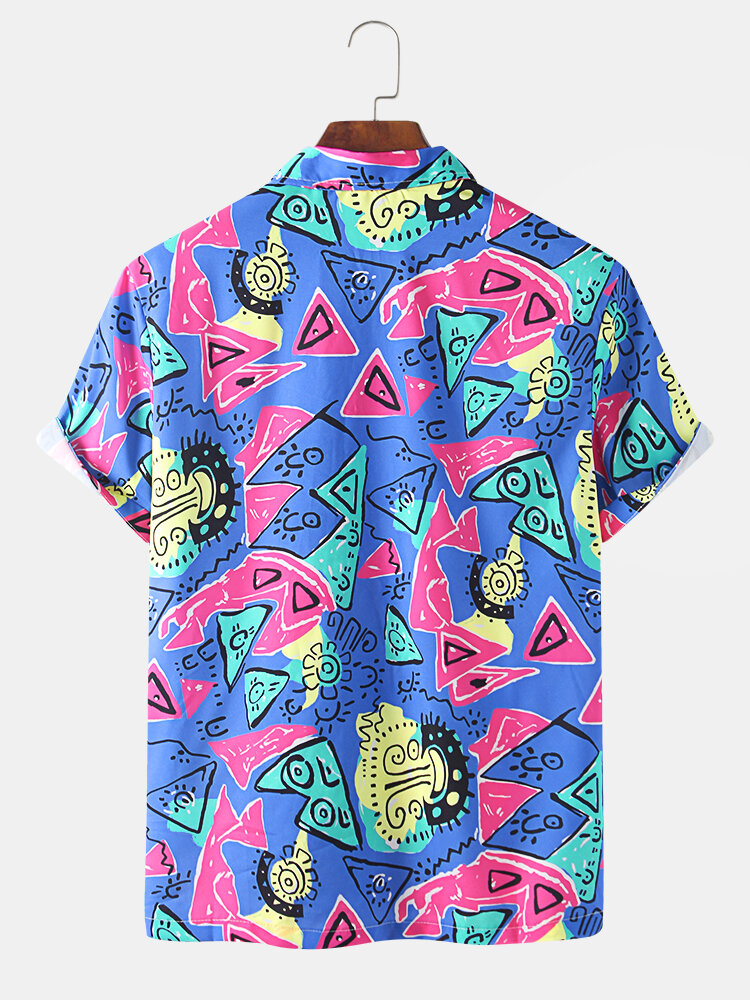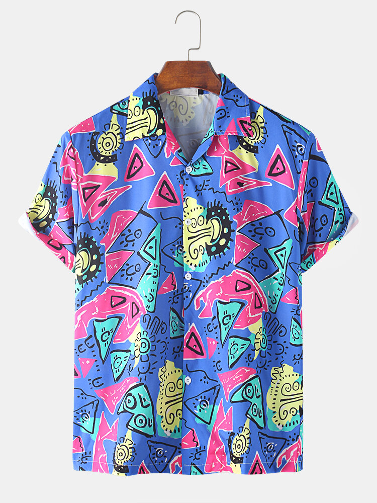 Men Funny Colorful Graffiti Abstract Geometric Printed Short Sleeve Casual Shirts – Blue 2XL