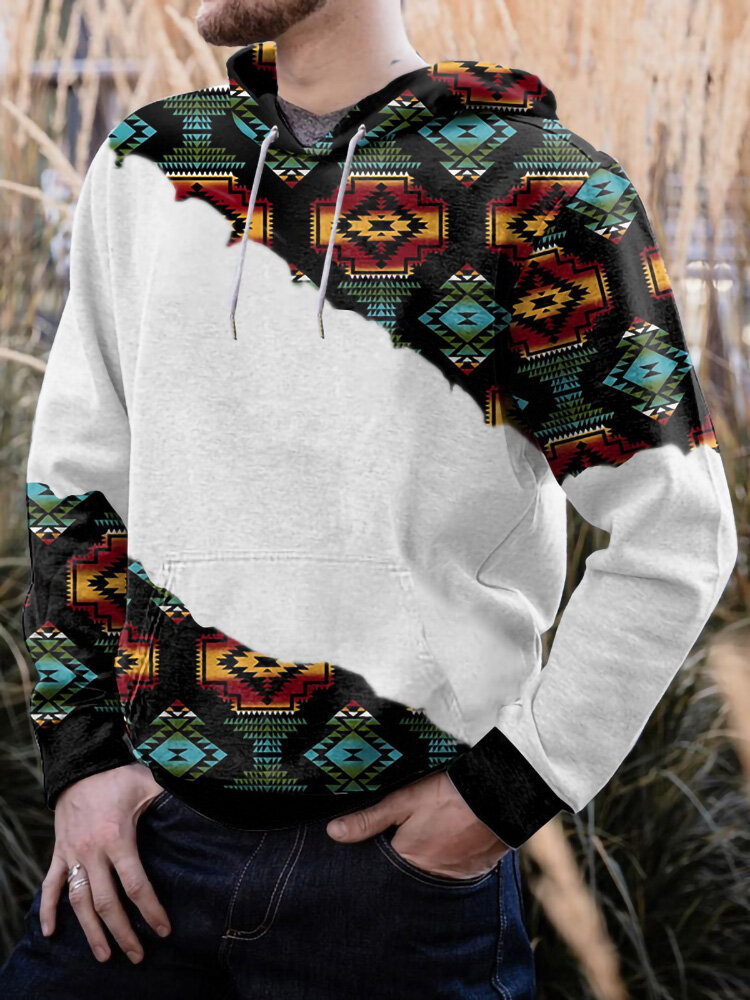 Men Geometric Pattern Patchwork Kangaroo Pocket Leisure Hooded Sweatshirt – Gray S