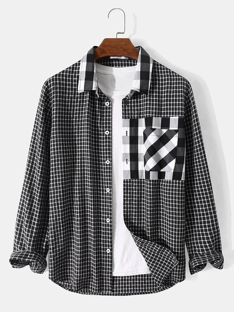 Men Gingham Plaid Patchwork Long Sleeve Casual Shirts – Black S
