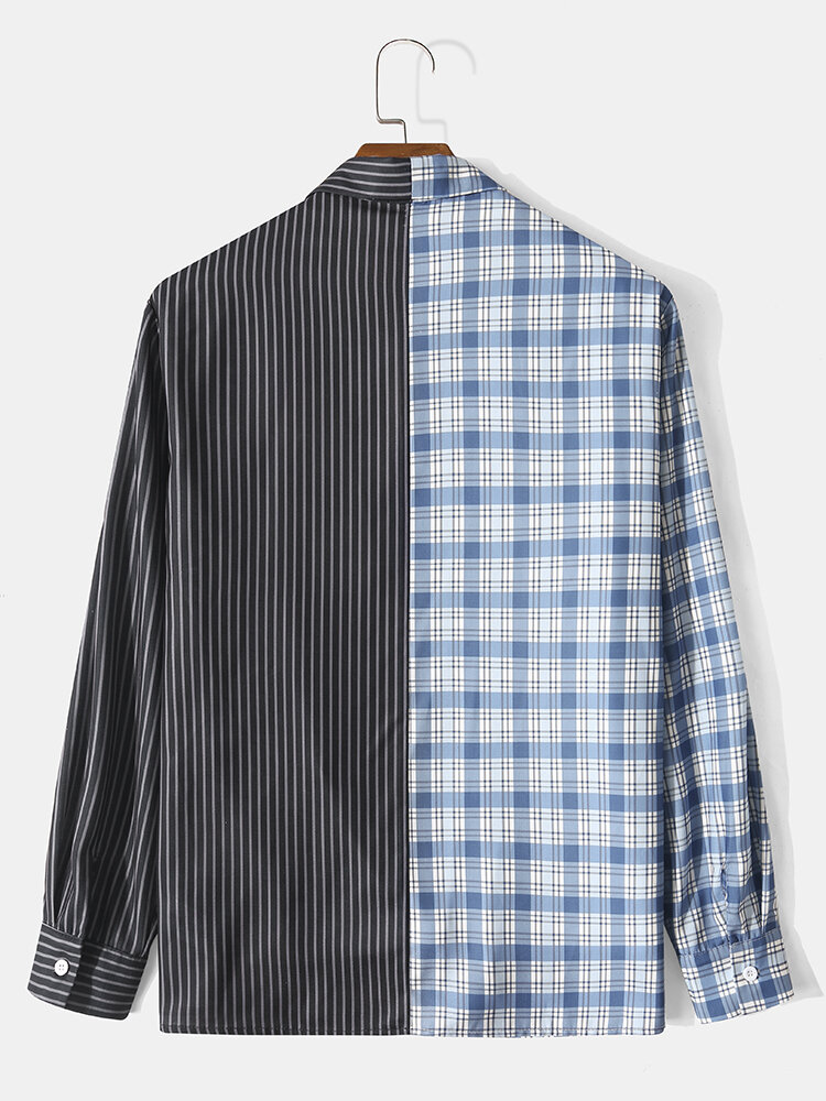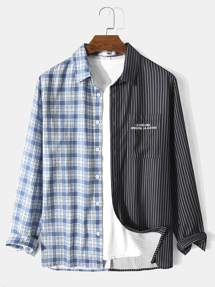 Men Gingham Striped Patchwork Chest Pocket Lapel Collar Shirts – Blue S