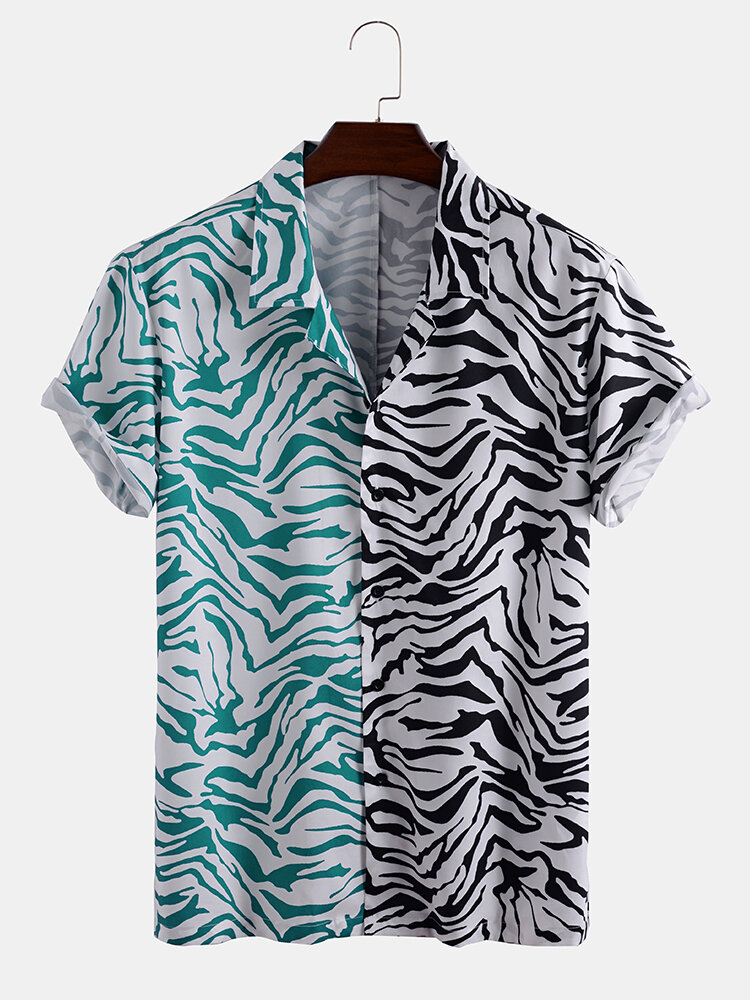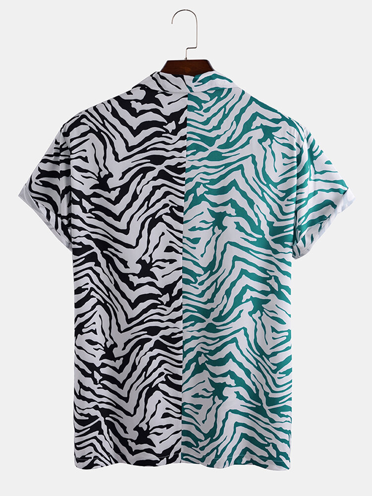 Men Green White Zebra Mixed Print Short Sleeve Casual Holiday Shirts – White 2XL