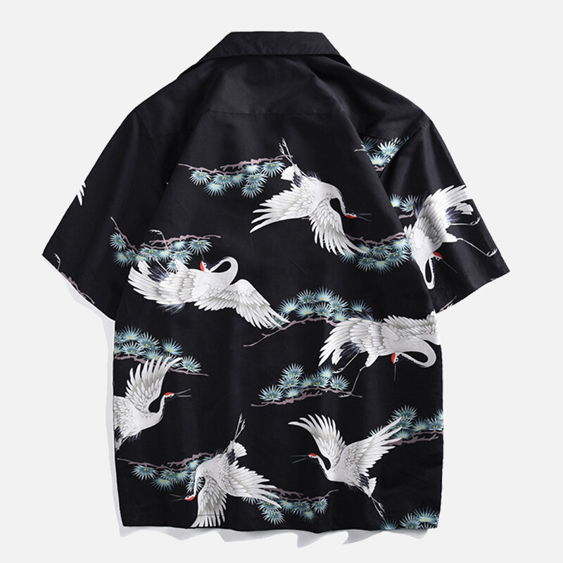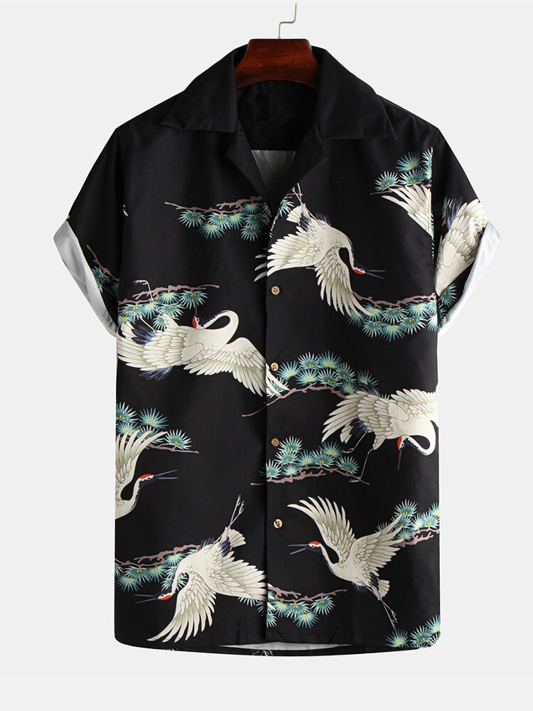 Men Hawaiian Holiday Red-crowned Crane Print Short Sleeve Beach Shirts – M Black
