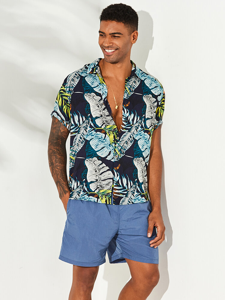Men Hawaiian Plants Printed Holiday Beachwear Shirts – L Blue