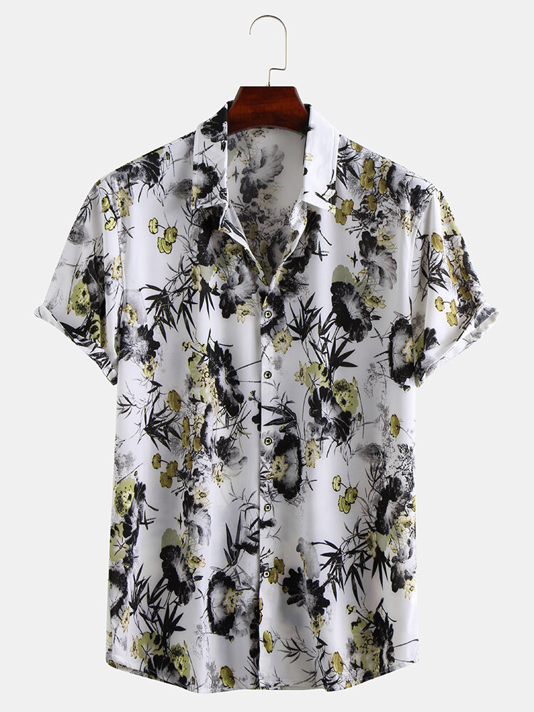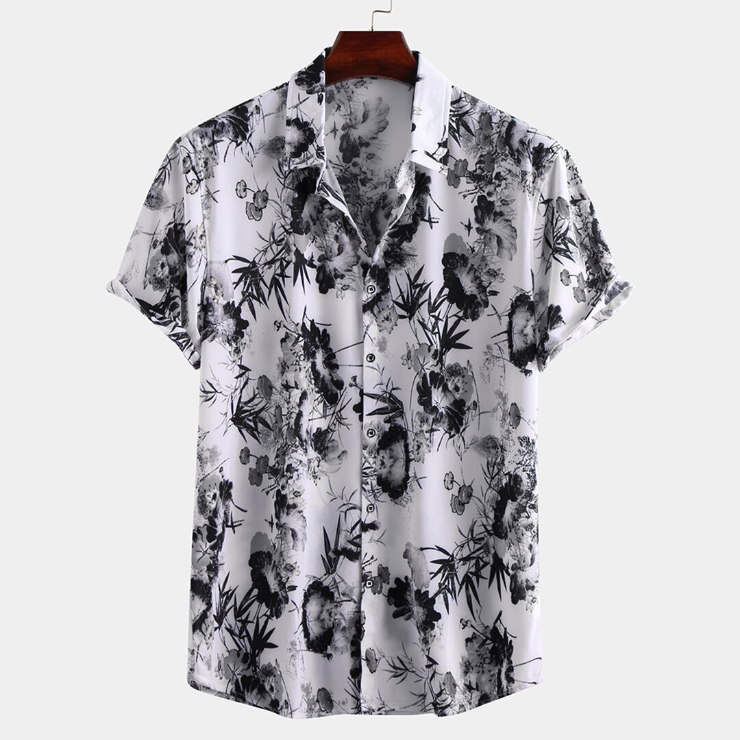 Men Ink Oriental Floral Print Short Sleeve Relaxed Shirts – 4XL Gray