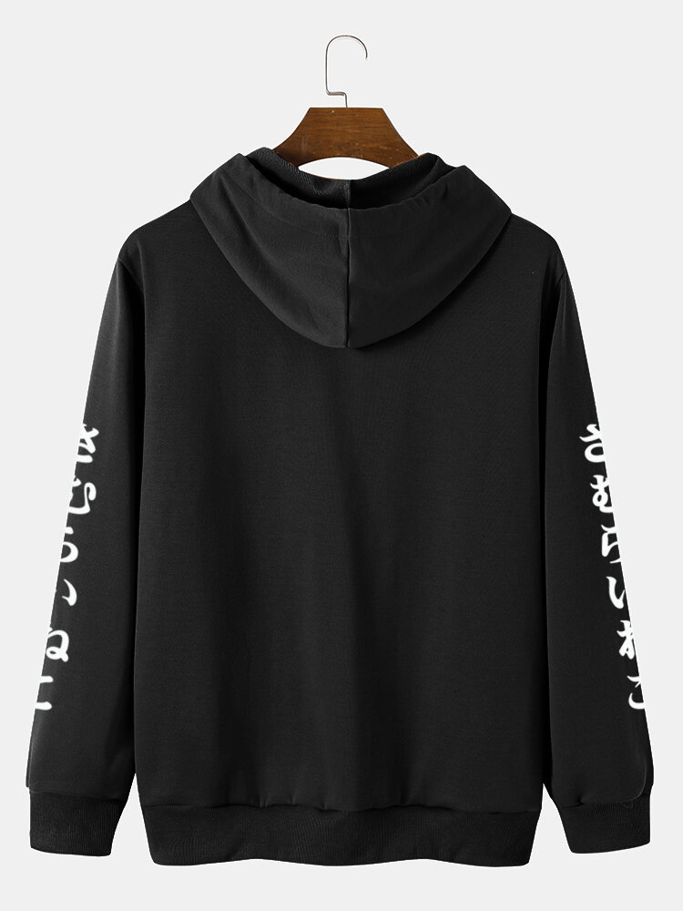 Men Japanese Style Cat Print Kangaroo Pocket Letter Casual Hooded Sweatshirt – Black S