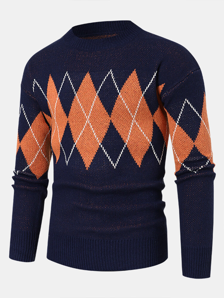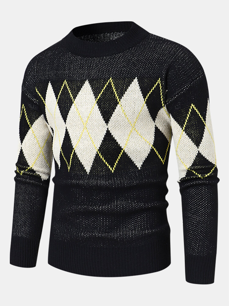 Men Knitted Lattice Long Sleeve Casual Round Neck Loose Sweaters – Black M