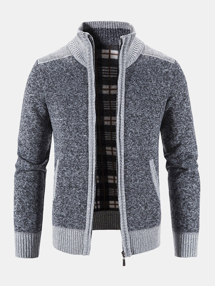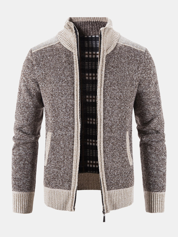 Men Knitted Plus Velvets High Neck Elastic Hem Pockets Zipper Sweater Cardigans – Coffee L