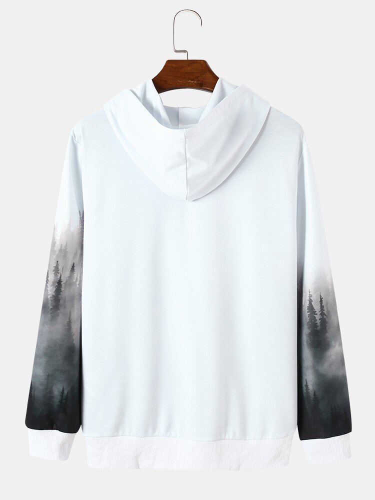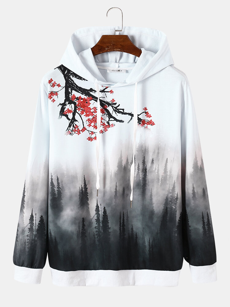 Men Landscape Blossom Trees Contrast Color Pullover Hooded Sweatshirt – White S