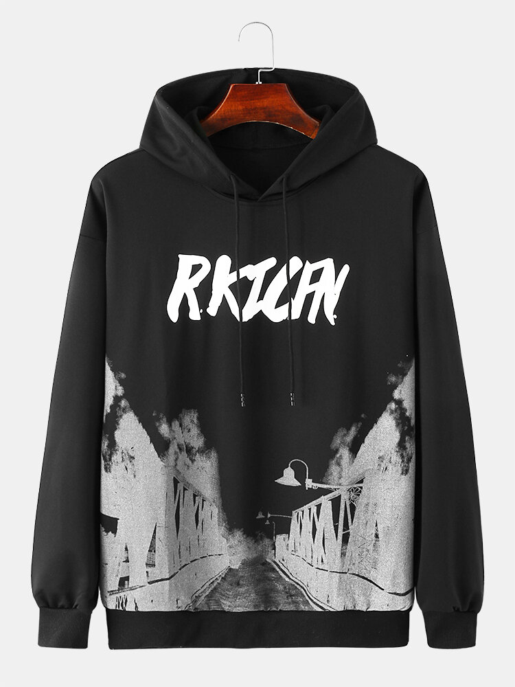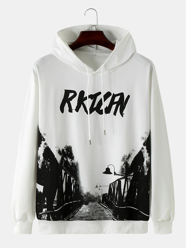 Men Landscape Printed Pattern Letter Drawstring Hooded Sweatshirt – White L
