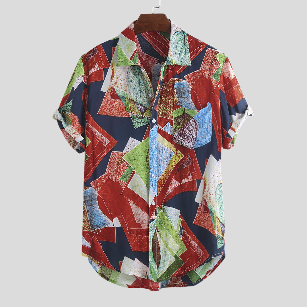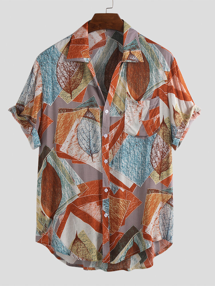 Men Leaf Printed Hit Color Turn Down Collar Short Sleeve – XL Yellow