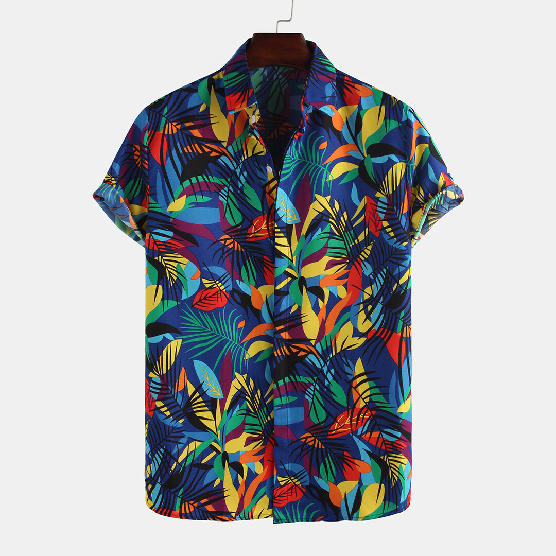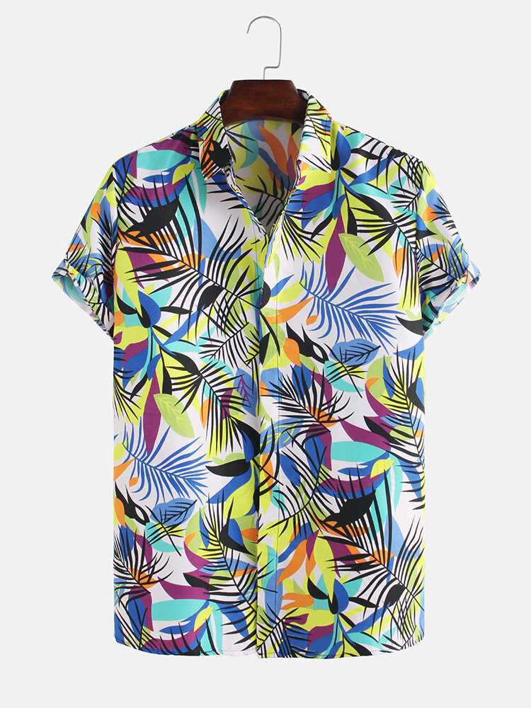 Men Leaf Printed Tropical Style Short Sleeve Lapel Casual Shirts – S White
