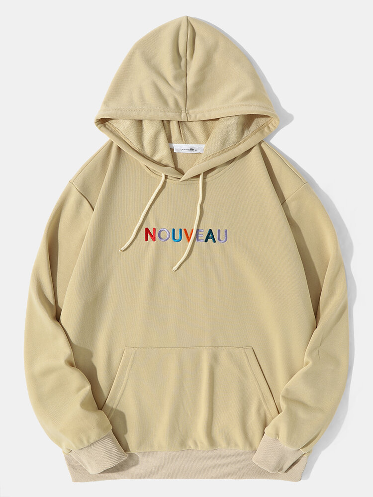 Men Letter Embroidered Drawstring Kangaroo Pocket Hooded Sweatshirt – Khaki S