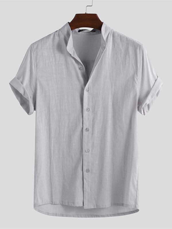 Men Linen Loose Casual Collarless Tops Holiday Casual Shirts – S Grey
