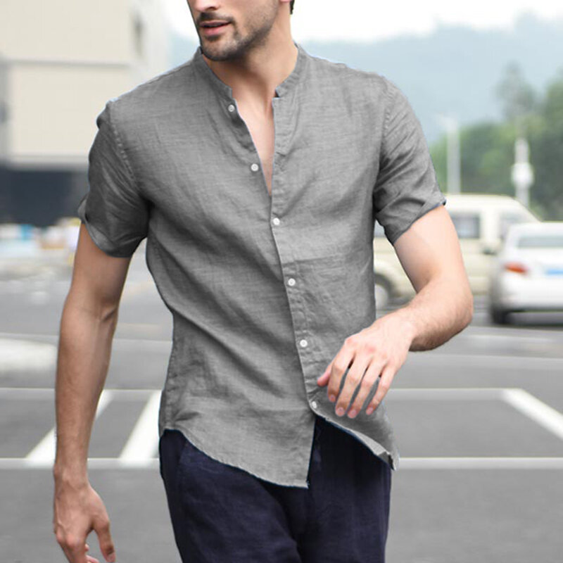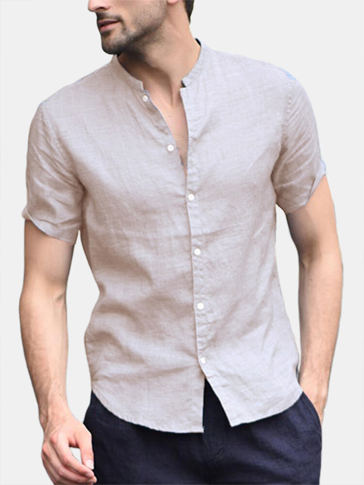 Men Linen Short Sleeve Shirt Beach Loose Soft Casual Collarless Shirt Tops Blouse – S Beige