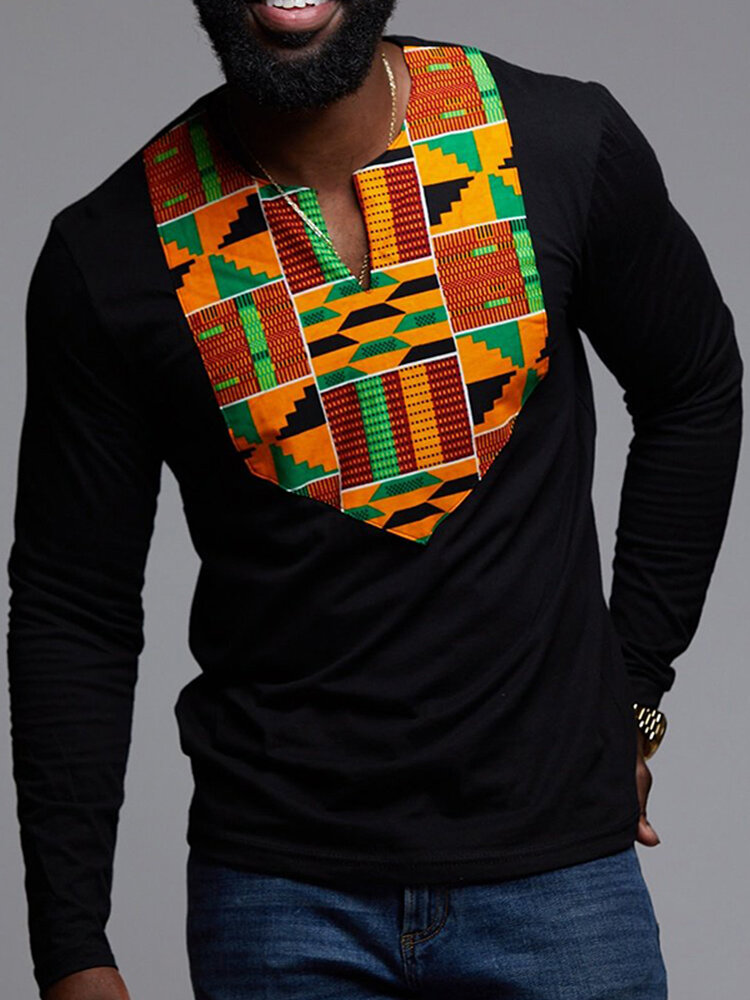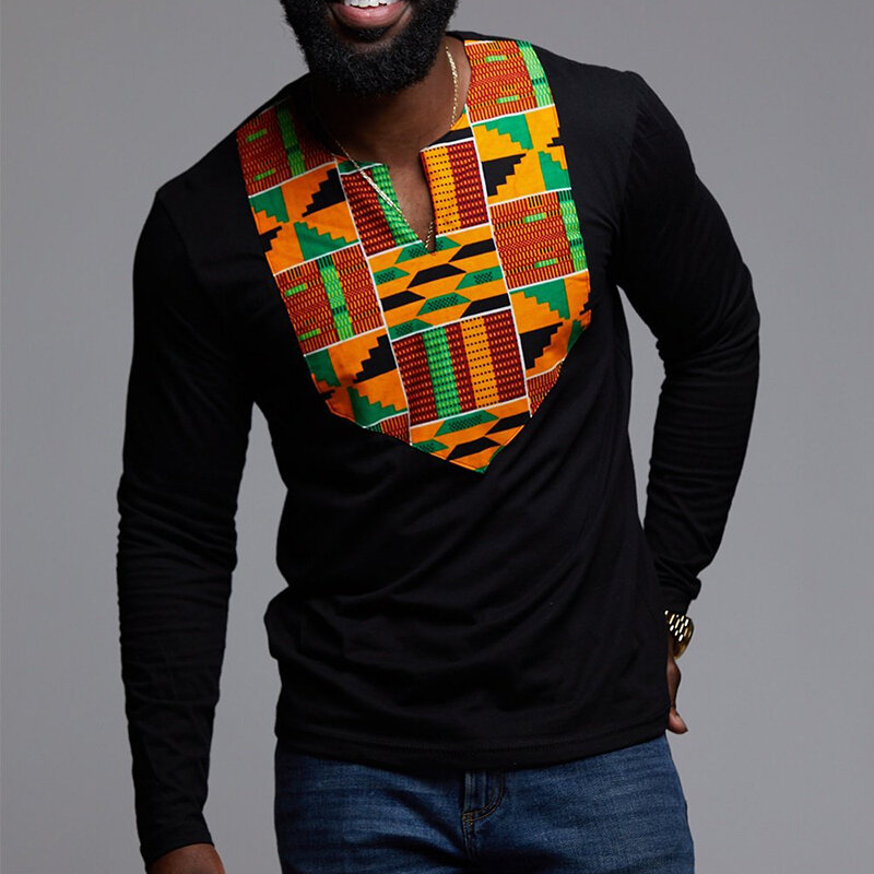 Men Long Sleeve Dashiki African Floral Shirts V Neck Long Sleeve Blouse Tops Tees – M Black