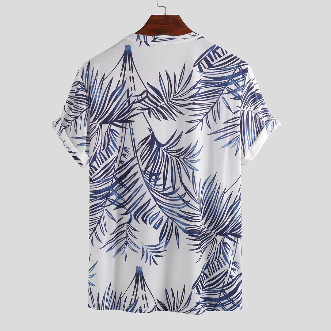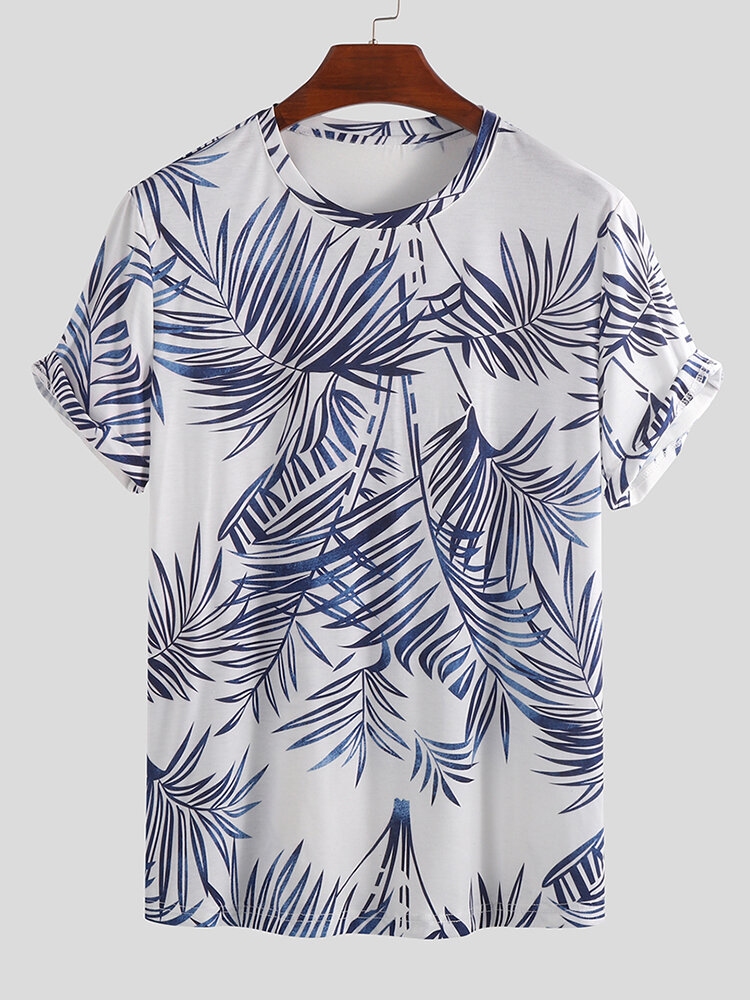Men Palm Leaf Print Short Sleeve Crew Neck Hawaiian T-Shirts – 2XL Green