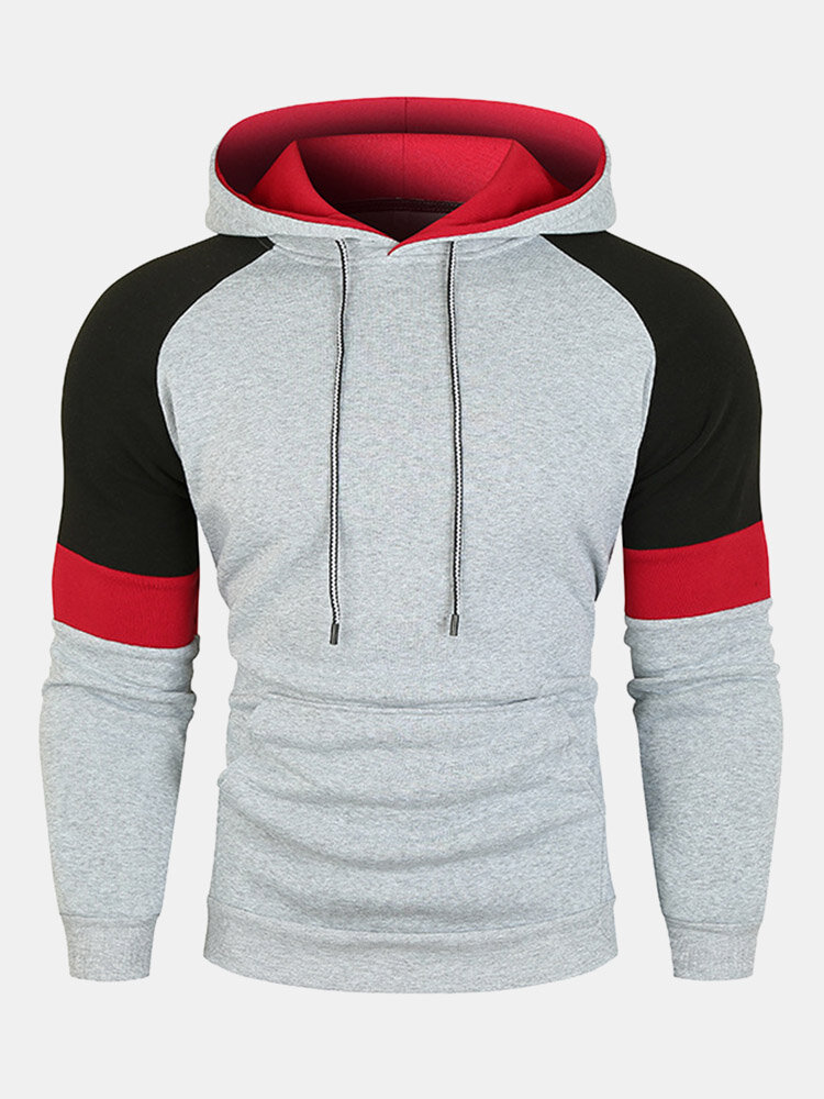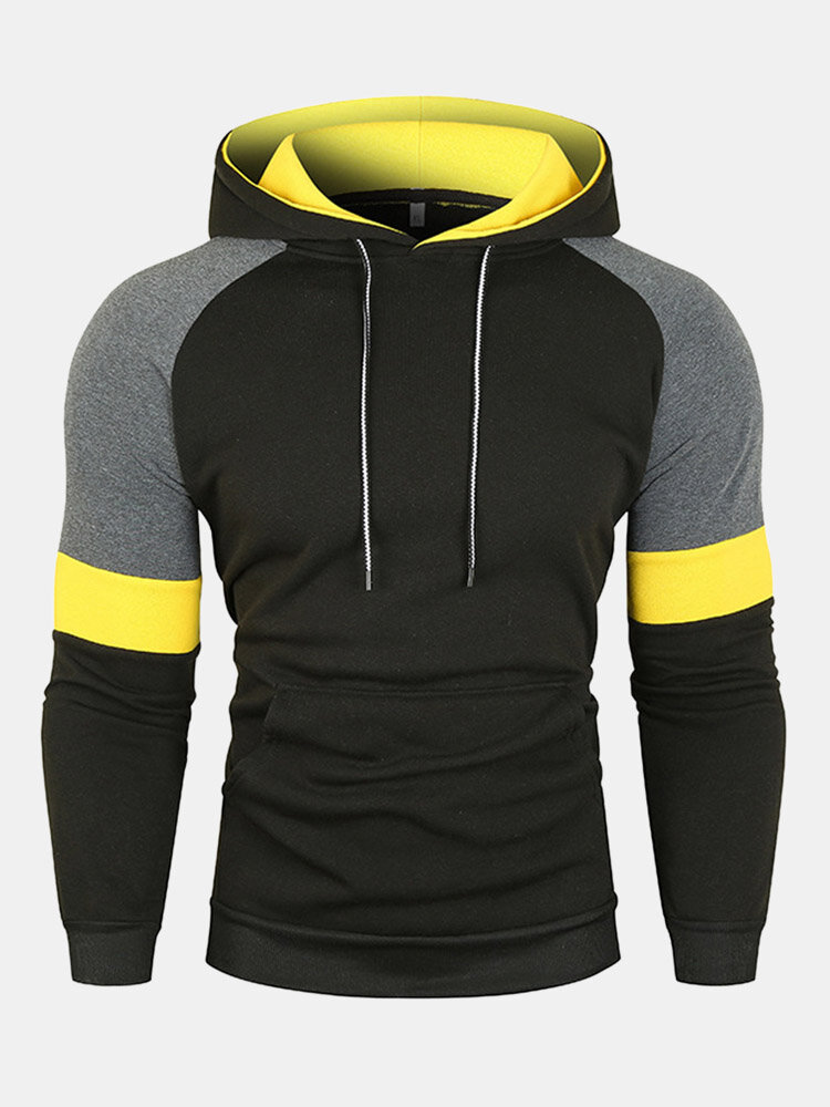 Men Patchwork Color Block Drawstring Casual Hooded Sweatshirt – Black XL
