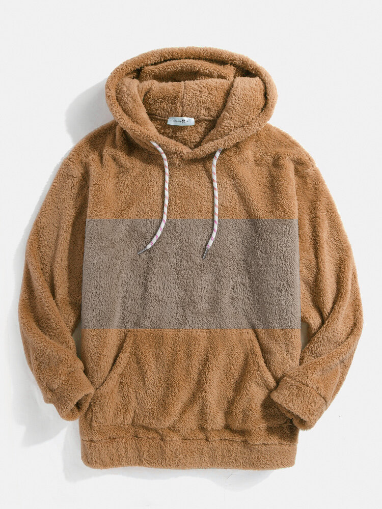 Men Patchwork Contrast Drawstring Casual Hooded Sweatshirt – Khaki S