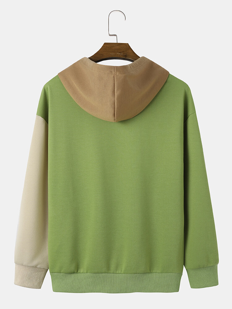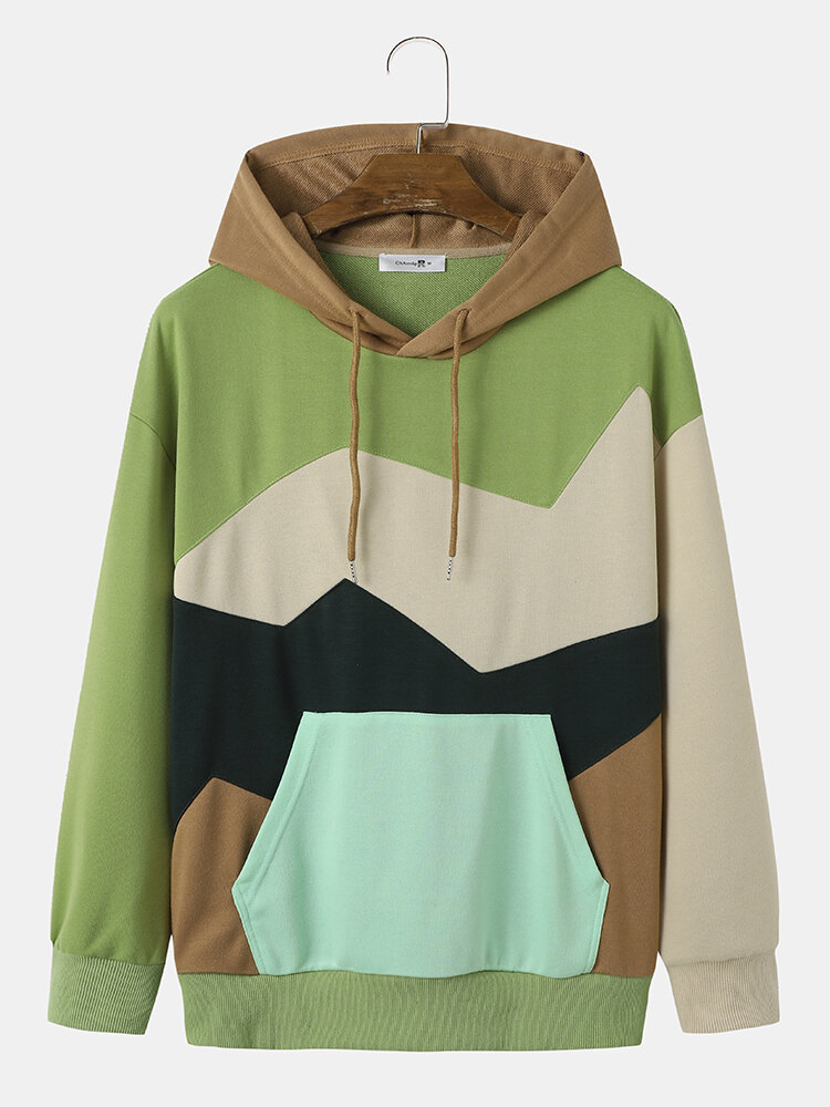 Men Patchwork Drawstring Kangaroo Pocket Casual Hooded Sweatshirt – Green S