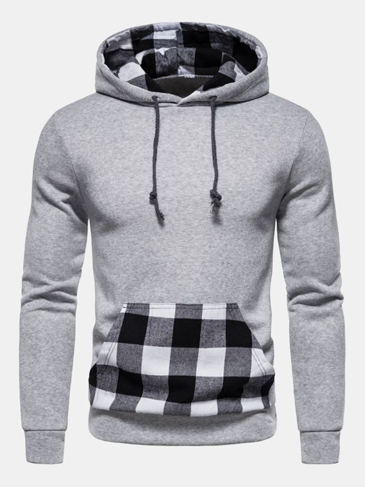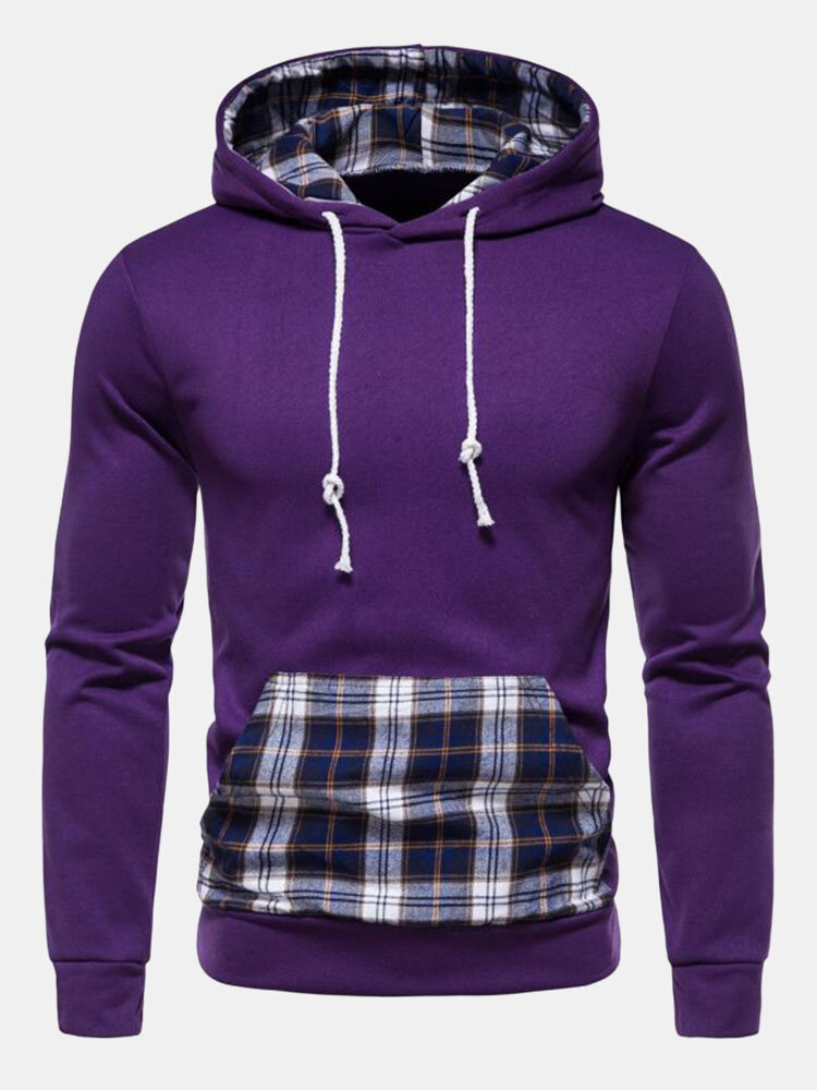 Men Patchwork Plaid Kangaroo Pocket Drawstring Casual Hooded Sweatshirt – Purple L