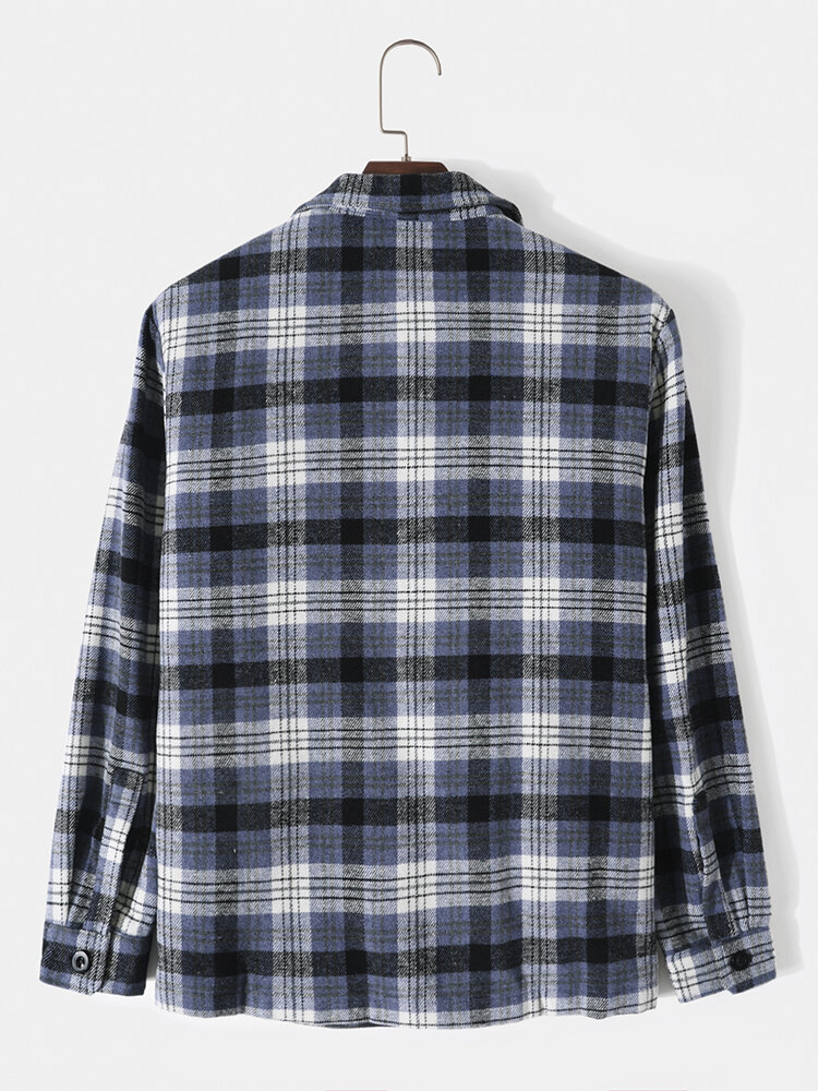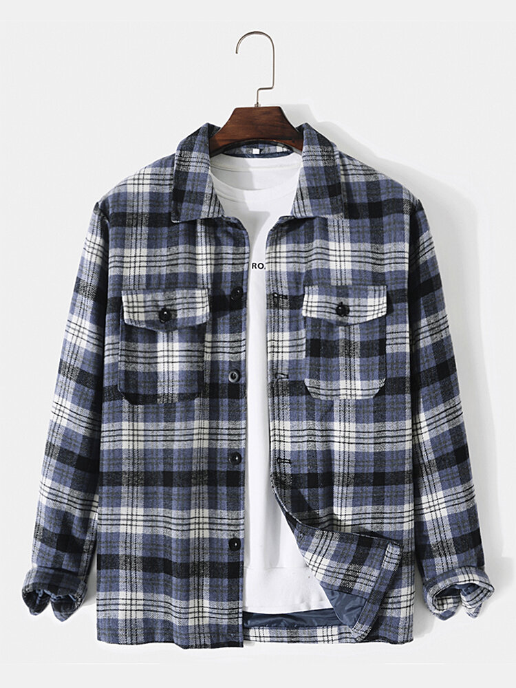 Men Plaid Chest Pockets Button up Lapel Shirts Long Sleeve Jackets – Blue S
