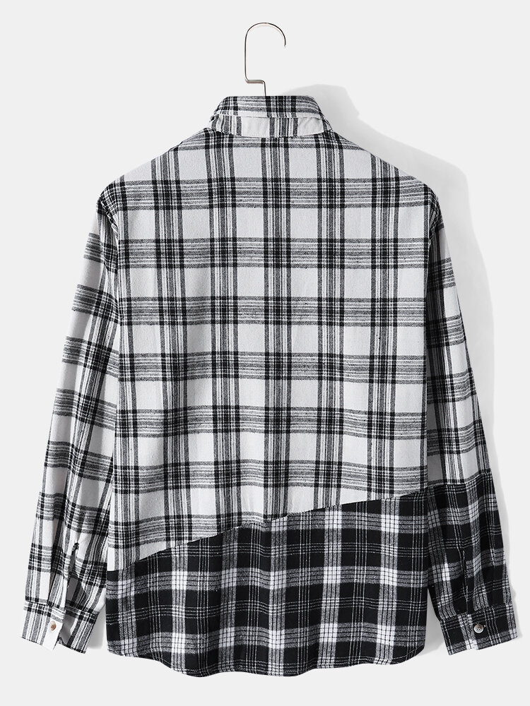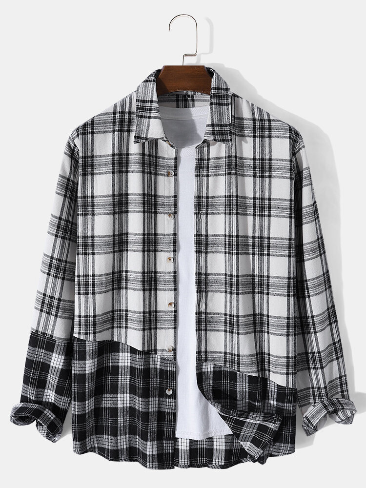 Men Plaid Patchwork Contrast Button Lapel Casual Shirts – Grey L